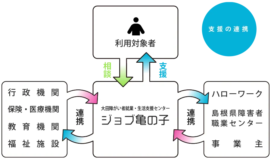 雇用、福祉、教育機関と協力して、障がいをお持ちの方の働く上での相談を受けたり、職場開拓や職場実習のあっせんをしたりして、地域の中で自立した生活を送るためのお手伝いをします。